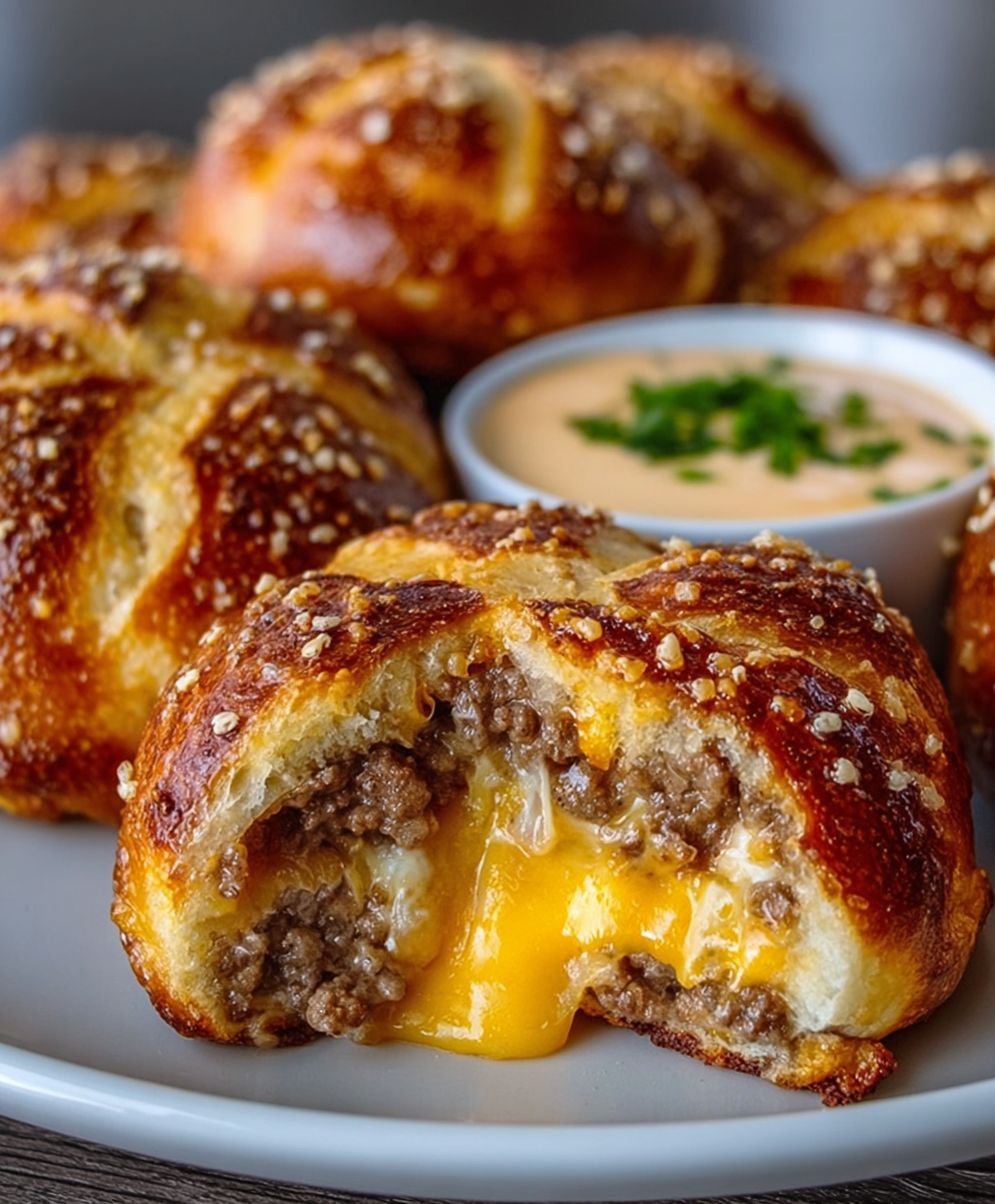Soft, golden pretzel buns stuffed with juicy beef and melty cheese — a bite-sized explosion of cheeseburger goodness!
